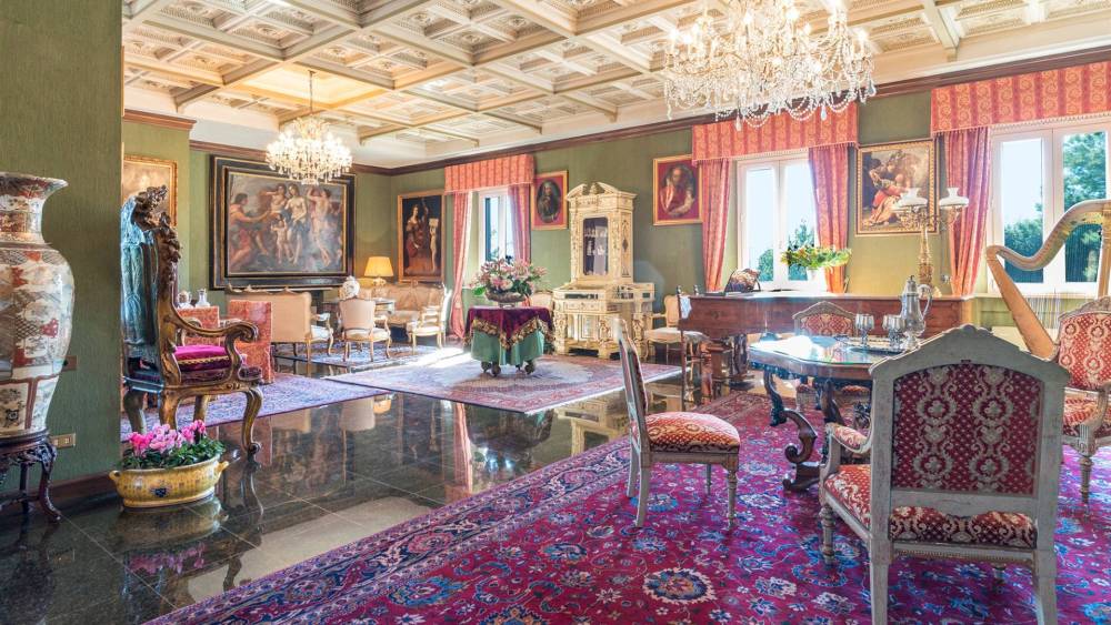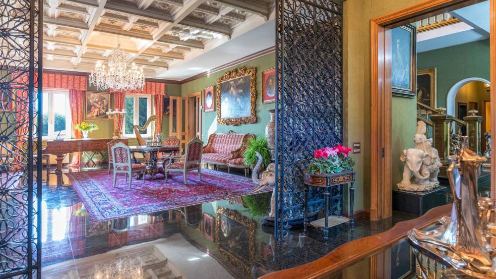 La villa, costruita negli anni 70 con grande attenzione alla qualità e al dettaglio, si presenta in ottime condizioni. Le sue atmosfere uniche sono esaltate da materiali pregiati e soluzioni architettoniche di grande fascino: pavimenti in marmo verde Ubatuba, una scenografica scala in marmo e ottone, imponenti lampadari in vetro di Murano e Boemia, affreschi e decorazioni dal sapore medievale e classico che donano allambiente uneleganza fuori dal tempo.