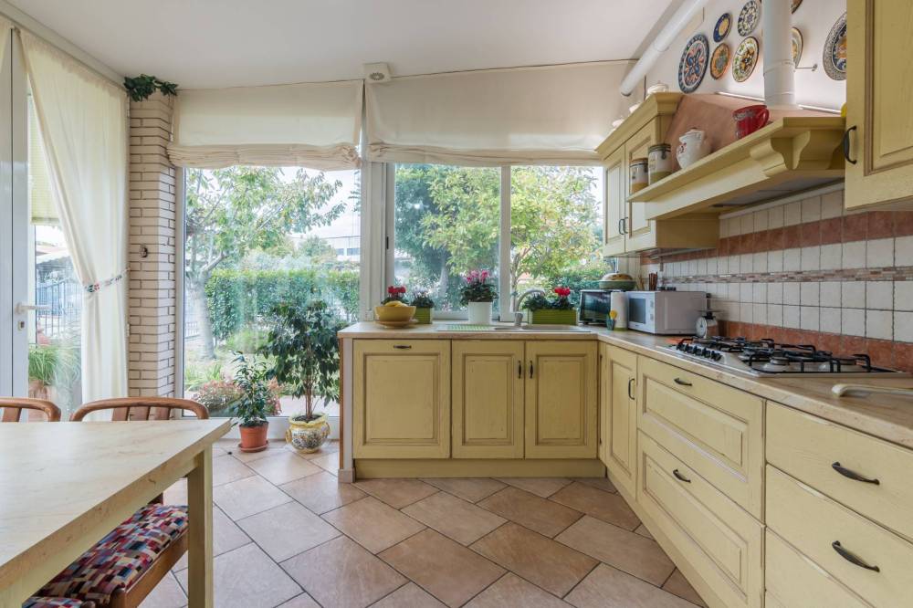 La cucina abitabile è composta da ampie finestre che regalano luce naturale per tutto il giorno con una comoda uscita diretta sul giardino, ideale per portare allesterno pranzi estivi.