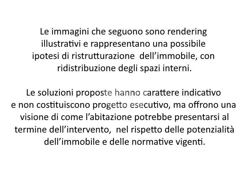 Sfogliando le foto potrete trovare i Rendering che illustrano una soluzione di ristrutturazione con la ridistribuzione degli spazi interni, ed arredo