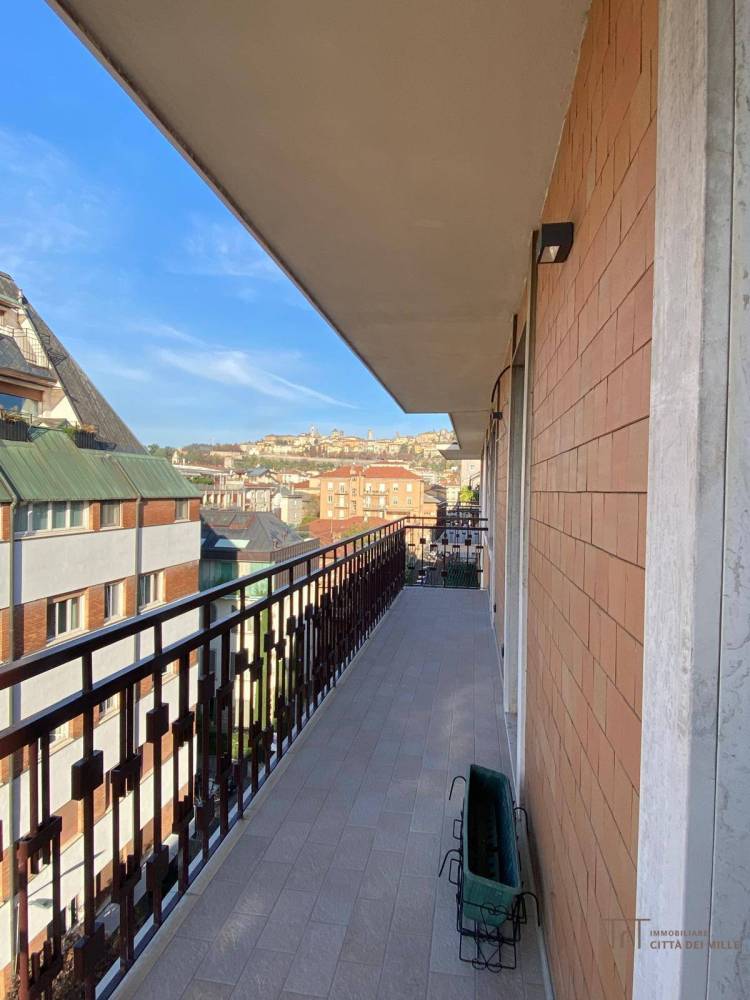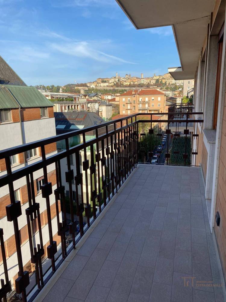 Appartamento PARZIALMENTE ARREDATO composto da: ingresso, soggiorno, cucinino, disimpegno notte, doppi servizi, lavanderia, due camere da letto e due ampi balconi di cui uno con vista di Città Alta.