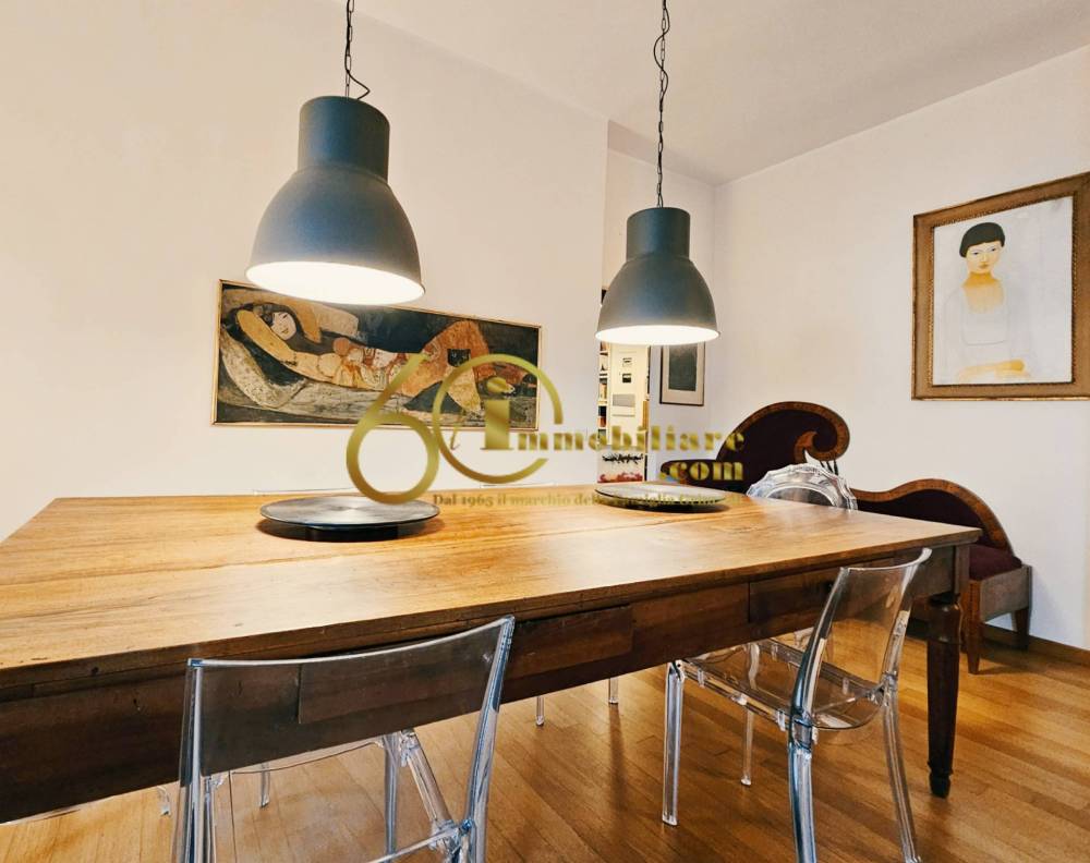 La luce calda delle lampade minimaliste a sospensione, in metallo nero, ci accolgono subito nellopen space del salone/sala da pranzo dal parquet in rovere e dotato di porta-finestra che fa da passaggio allelegante terrazza a livello attrezzata, comunicante con gli altri ambienti della casa.
