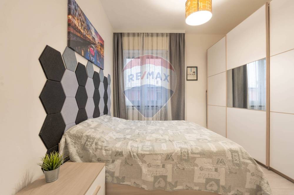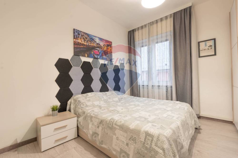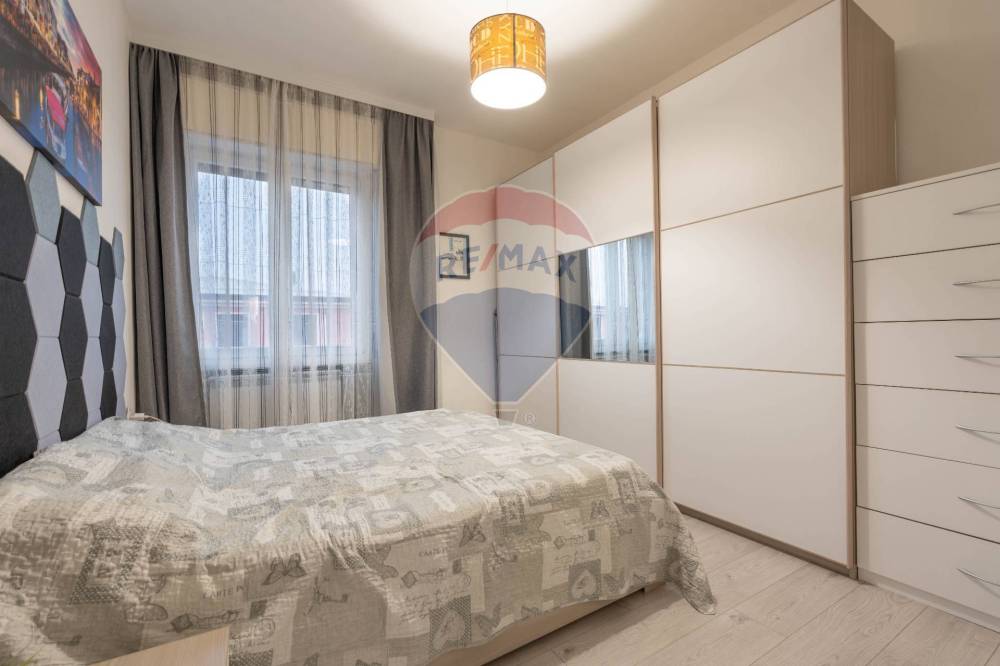 La zona notte comprende una spaziosa camera matrimoniale e un bagno finestrato con box doccia.