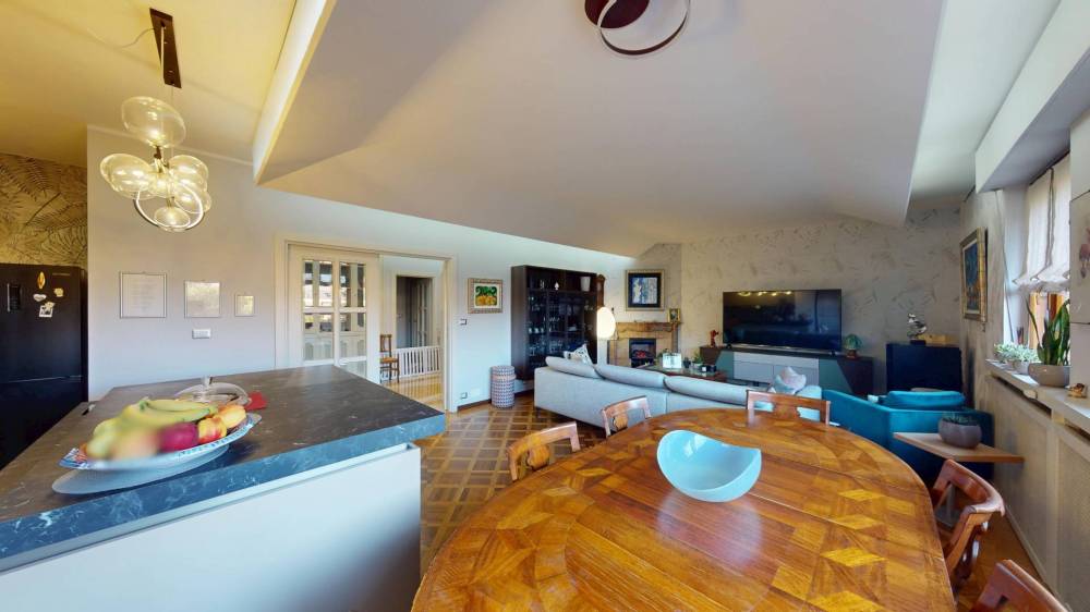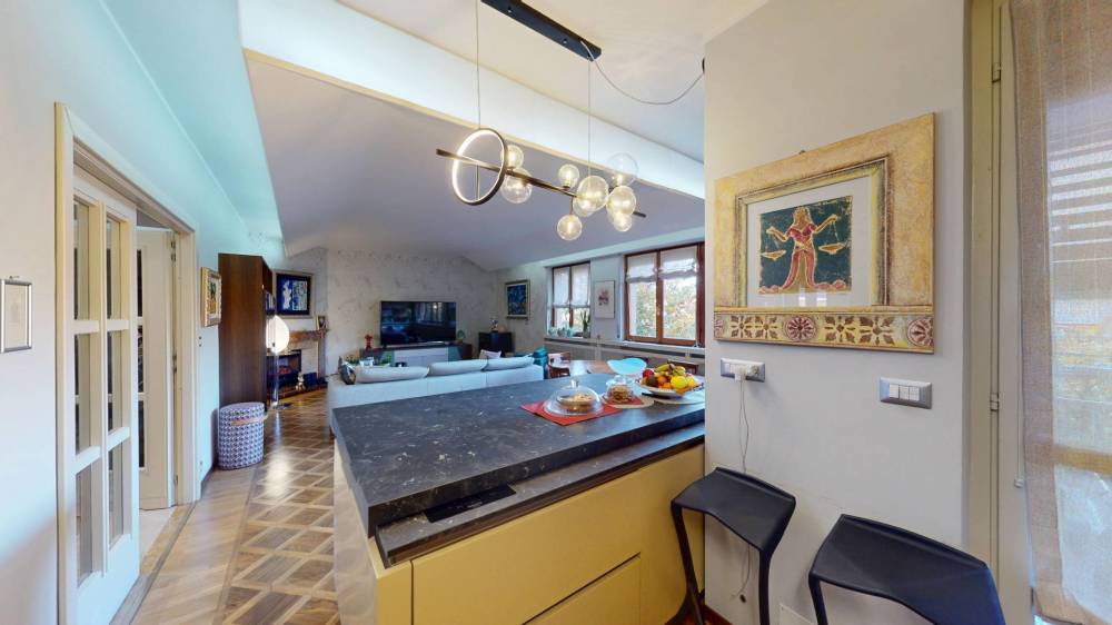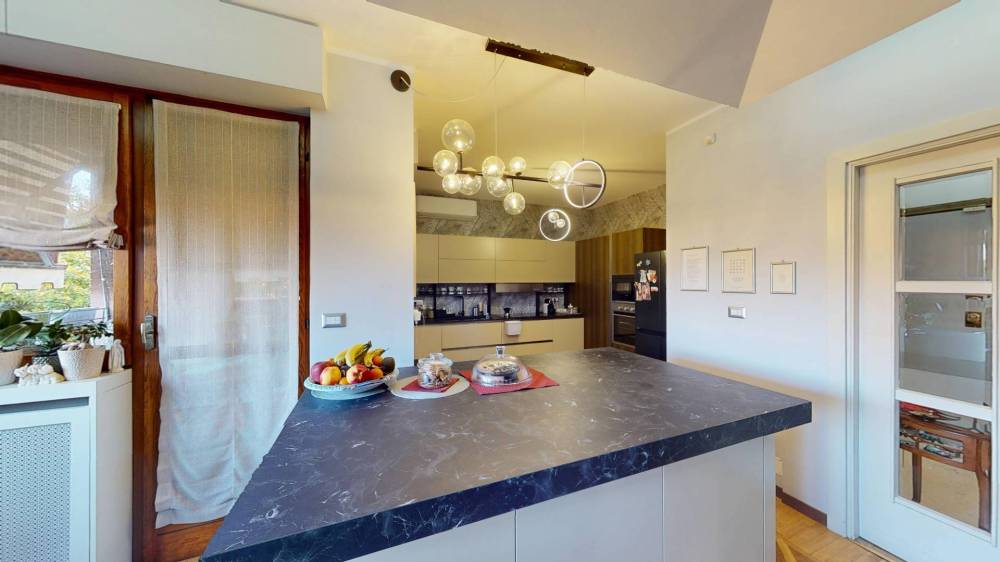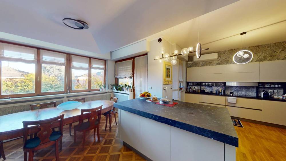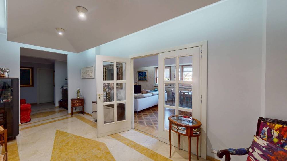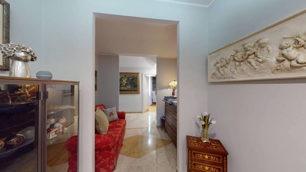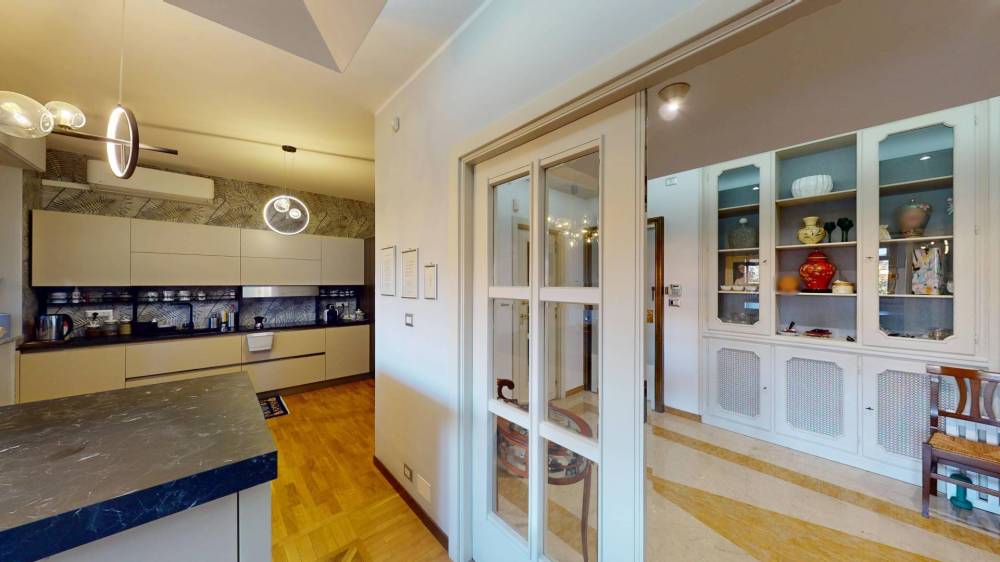 L'immobile, in ottime condizioni interne, è cosi composto: ingresso su disimpegno, ampia zona giorno con angolo cottura e doppia uscita sul balcone, seconda cucina abitabile, tre camere da letto di cui una dotata di bagno en suite con rivestimento in marmo di Carrara, tre bagni, tutti con finestra, ripostiglio e cabina armadio con accesso da una delle camere da letto.