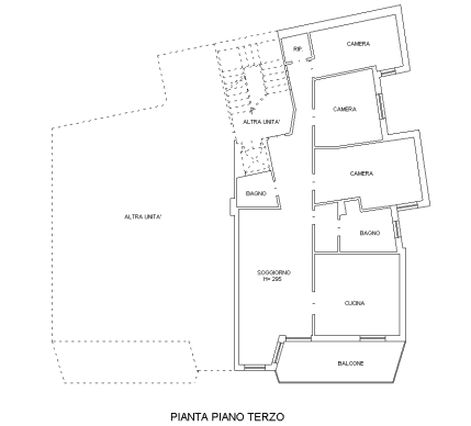 L'unità abitativa è posta al terzo piano ed è cosi composta: da ingresso, tre camere da letto, cucina, soggiorno, due bagni, balcone e una cantina al piano terra e box auto di circa 17mq.