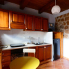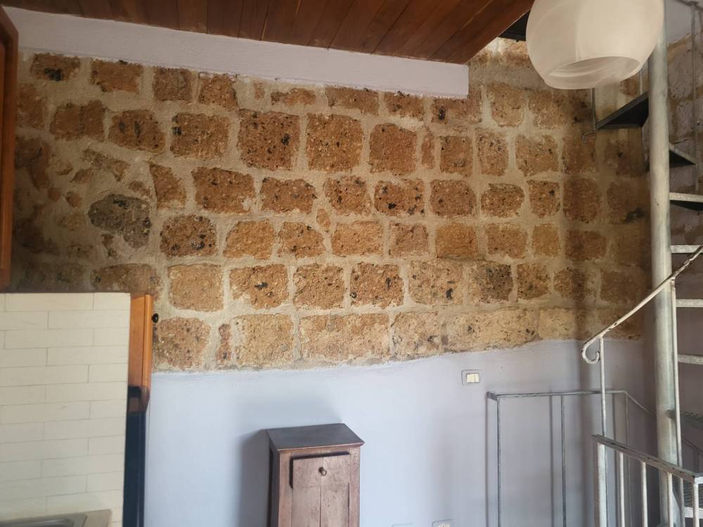 Varcando la soglia dellimmobile, tramite due scalini, ci si trova nel piano intermedio dove cè la cucina e il camino. Il pavimento in simil cotto, il soffitto a cassettoni e la parete frontale con i mattoni di tufo a vista rendono lambiente rustico e accogliente. Oltre alla porta dingresso dalla quale entra luce naturale, cè una graziosa finestra.