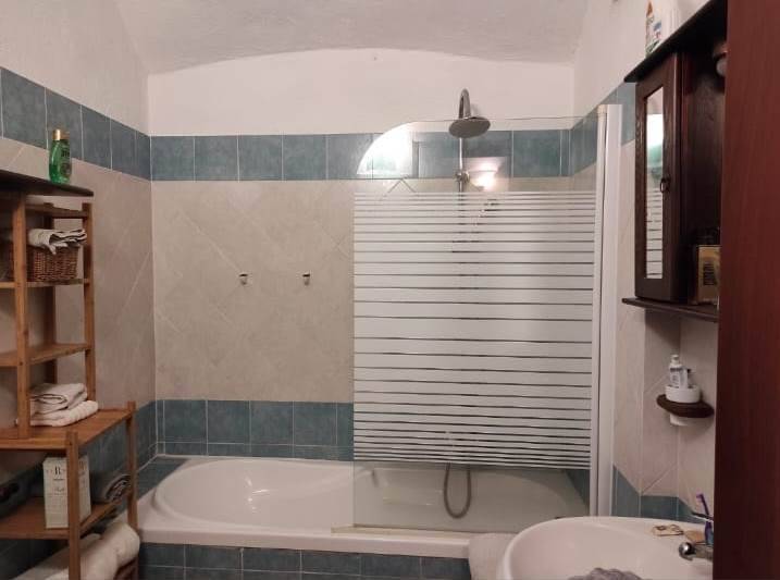 Nel piano interrato vi è un disimpegno con un armadio molto capiente e un bagno grande con vasca.