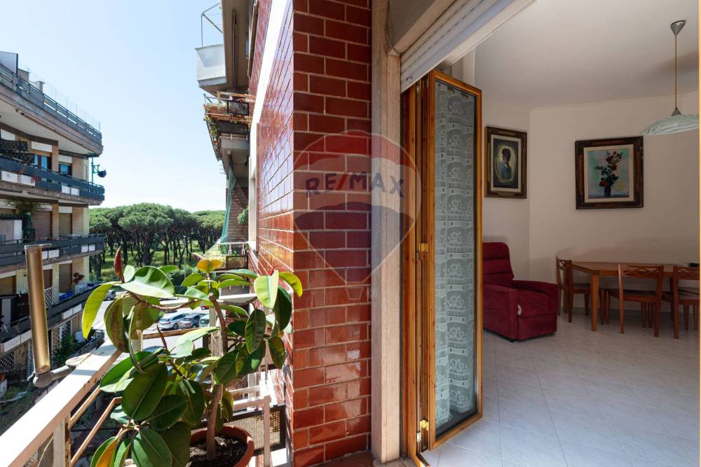 L'appartamento è dotato di un balcone che offre una piacevole vista sul verde circostante della pineta di Ostia.
