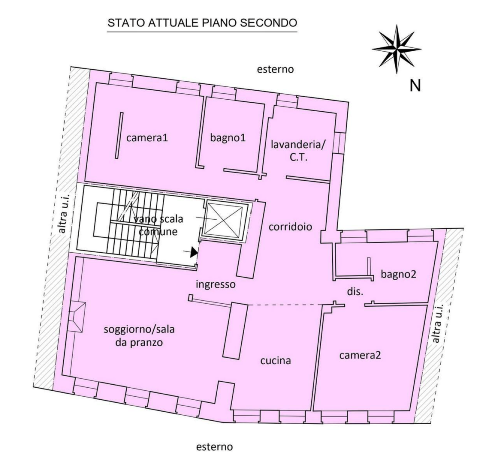 Appartamento al piano secondo di una palazzina in centro storico situata a Thiene (VI) in via Santa Maria Maddalena, composta da un ingresso, soggiorno-sala da pranzo, una cucina, ampio corridoio centrale, lavanderia con centrale termica, due camere da letto, disimpegno e due bagni.
