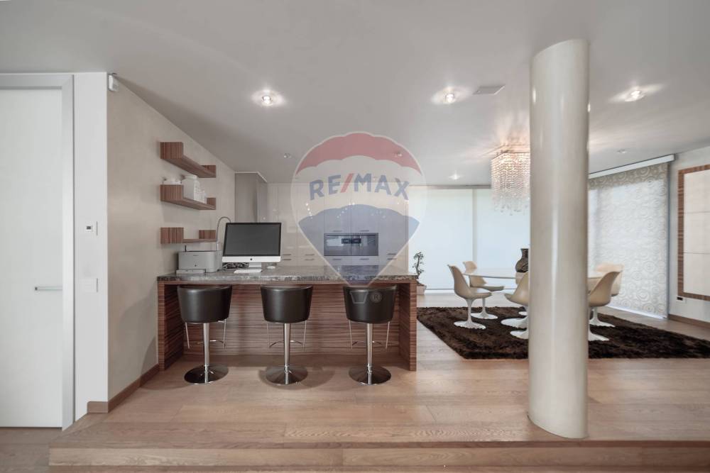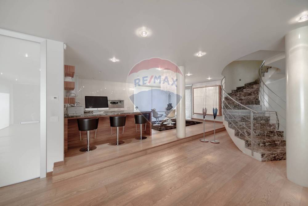 Al piano principale, il cuore della casa accoglie con un ampio soggiorno e una zona pranzo che dialoga armoniosamente con la cucina a vista, valorizzata da unelegante sopraelevazione. Una finestra angolare scenografica incornicia la luce naturale, rendendo ogni momento vissuto in questa zona unesperienza estetica. Le finiture sono di altissimo livello: parquet in rovere naturale, bagno di servizio rifinito in mosaico Bisazza oro e resina, infissi a tutta altezza in alluminio e portoncino blindato in vetro e acciaio.