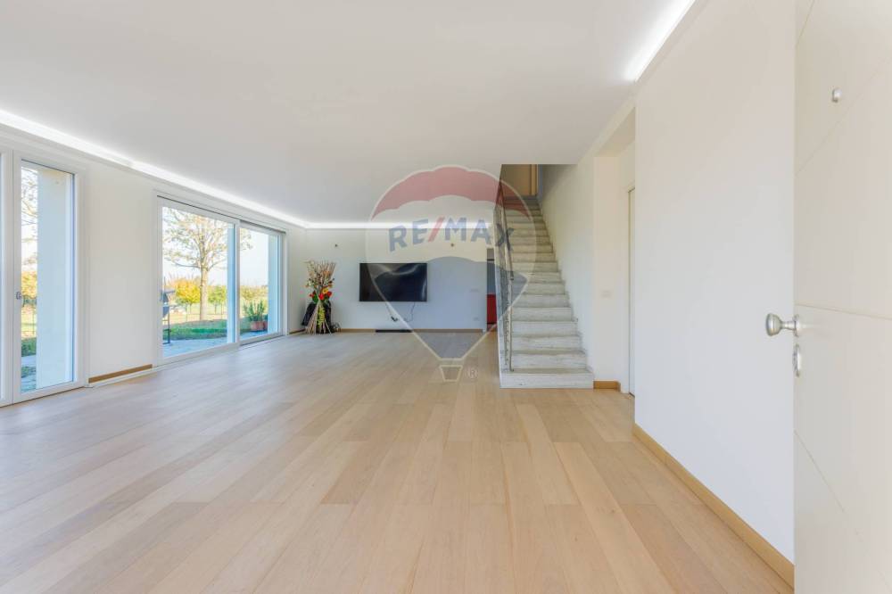 La zona giorno è un grande spazio di luce e proporzioni perfette: ampie vetrate si aprono sul giardino privato di circa 980 m², creando continuità tra interno ed esterno, tra bellezza e natura. La cucina, ampia e abitabile, è il cuore conviviale della casa: qui il tempo rallenta, i gesti diventano rituali, ogni momento ha un suo ritmo.