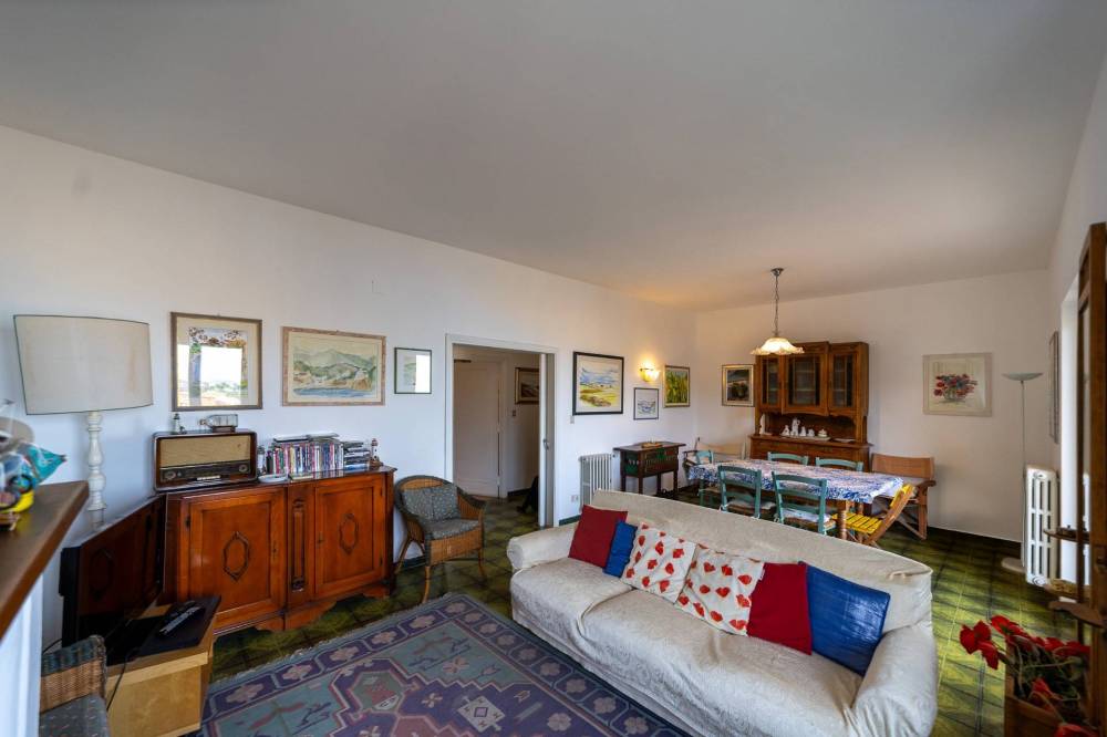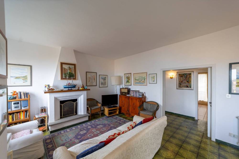 Lingresso conduce a un ampio soggiorno con camino, ambiente accogliente e ideale per momenti di relax e convivialità, che si apre su un ampio balcone vivibile, perfetto per godere del panorama mozzafiato sul mare. La cucina, separata e ben organizzata, dispone di un balcone di servizio.
