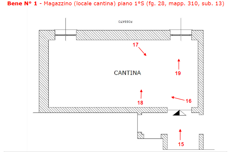 Lotto composto da piena proprietà di magazzino ubicato in Ronco Scrivia (Ge), frazione di Borgo Fornari, Corso Trento e Trieste, edificio 174, piano 1° S, superficie commerciale mq 27,70 ed altezza m. 3, che si sviluppa occupando una porzione del piano interrato dell'edificio; sono presenti due finestrelle sul lato est.