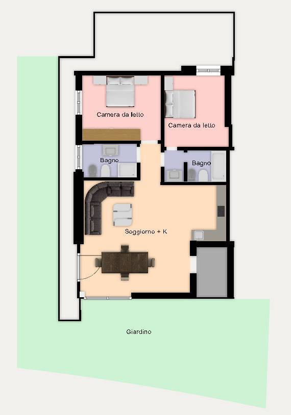 Sito al piano terra l'immobile è composto da ingresso su spazioso soggiorno con angolo cottura open space, due bagni con doccia e due camere da letto.
