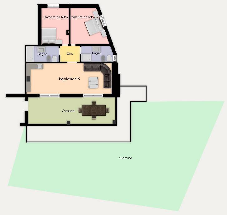 Sito al piano terra l'immobile è composto da ingresso su spaziosa ed elegante veranda vetrata, soggiorno con angolo cottura, due bagni con doccia e due camere da letto.