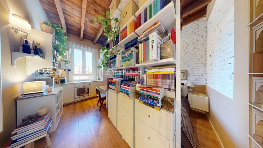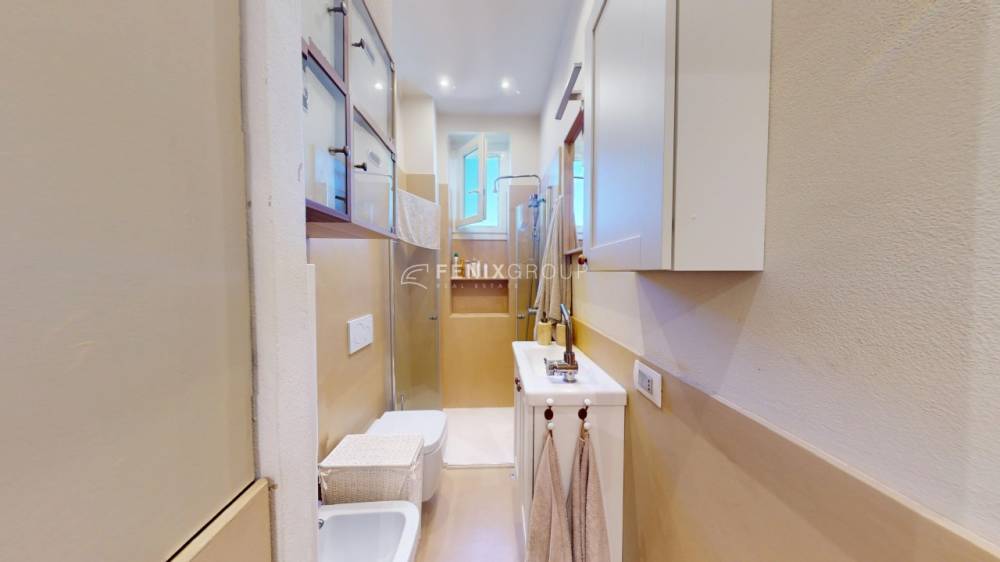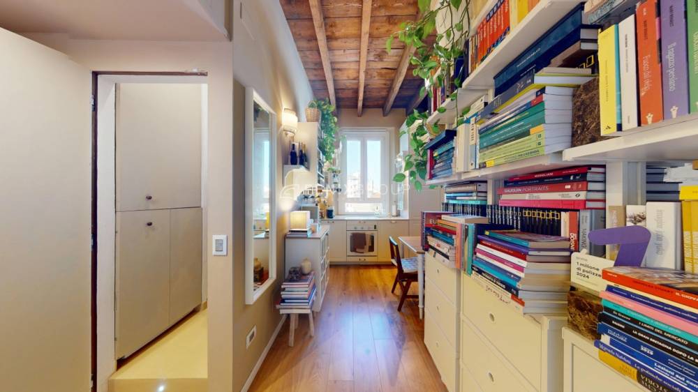 L’appartamento, posto al quarto piano di una palazzina d’epoca senza servizio di portineria, si sviluppa in un unico ambiente ben organizzato e luminoso.