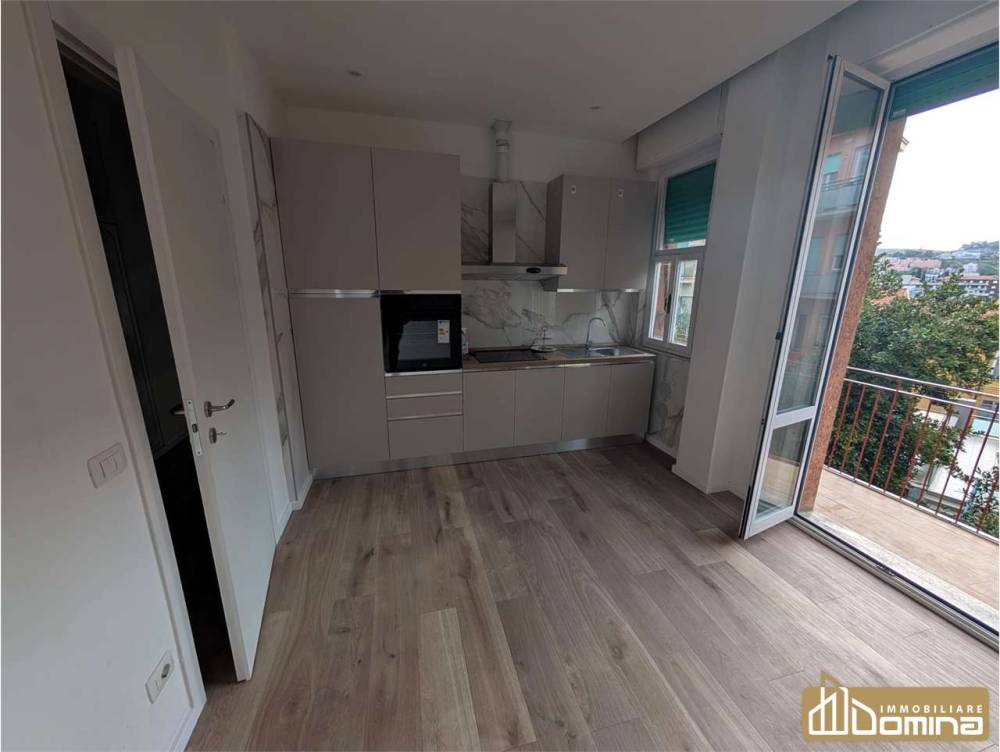 ingresso su corridoio, luminoso soggiorno con balcone, cucina abitabile con balcone, camera matrimoniale, camera doppia, bagno e ripostiglio.