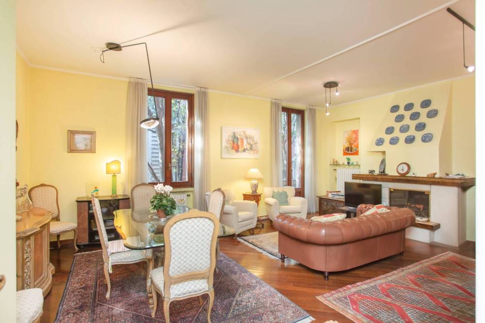 La zona giorno, accoglie un ampio salone con camino e balcone affacciato sulla suggestiva e alberata Via Monti, mentre la zona notte e la cucina, si aprono sulla tranquilla corte interna.