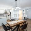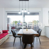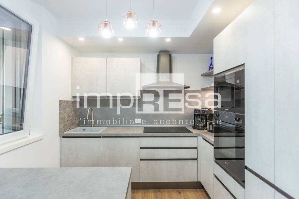 La zona giorno è caratterizzata da una moderna cucina a vista, da un soggiorno che affaccia, tramite un' ampia vetrata scorrevole, un terrazzo privato abitabile di circa 15 metri quadri e un disimpegno e un bagno di servizio.