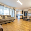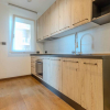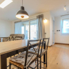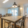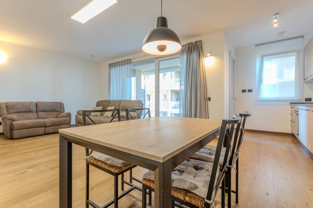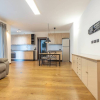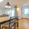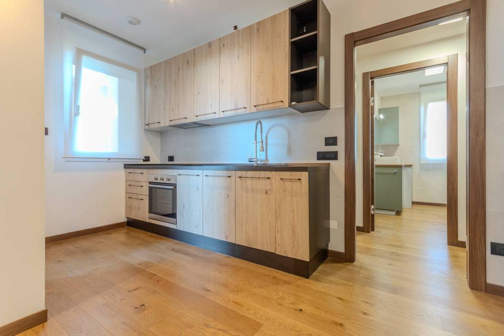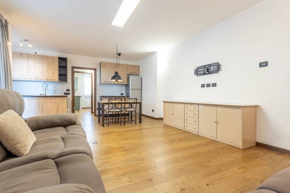La zona giorno prosegue con unaccogliente area pranzo e un angolo cottura semi-nascosto, pensato per coniugare funzionalità ed estetica.