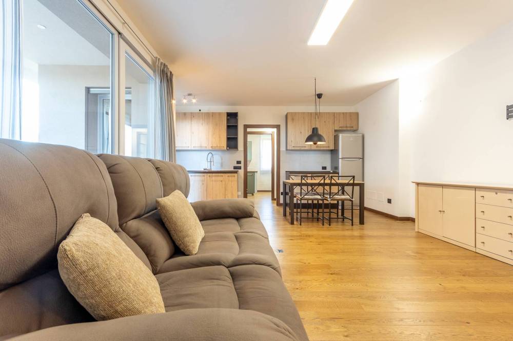 Lappartamento si apre su un luminoso soggiorno impreziosito da unampia vetrata a tutta parete, che regala una splendida luce naturale e affaccia su un terrazzo esposto a sud di 15 mq, ideale per momenti di relax e convivialità nelle giornate di sole.