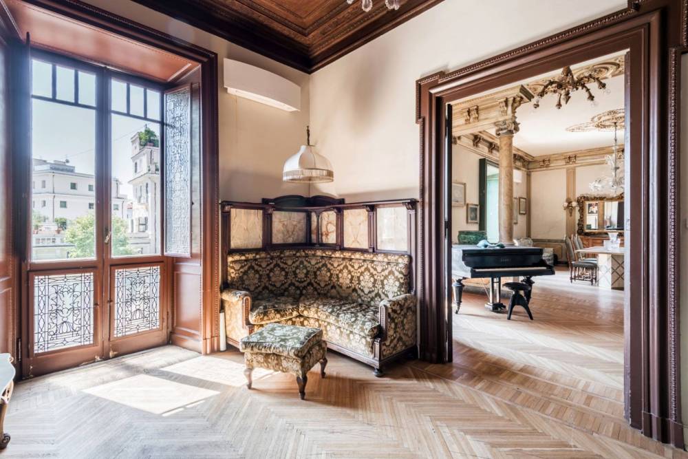 Gli spazi interni sono impreziositi da soffitti alti, alcuni affrescati e altri con raffinate cassettonature, boiserie depoca e finiture originali che conferiscono carattere e prestigio allimmobile.