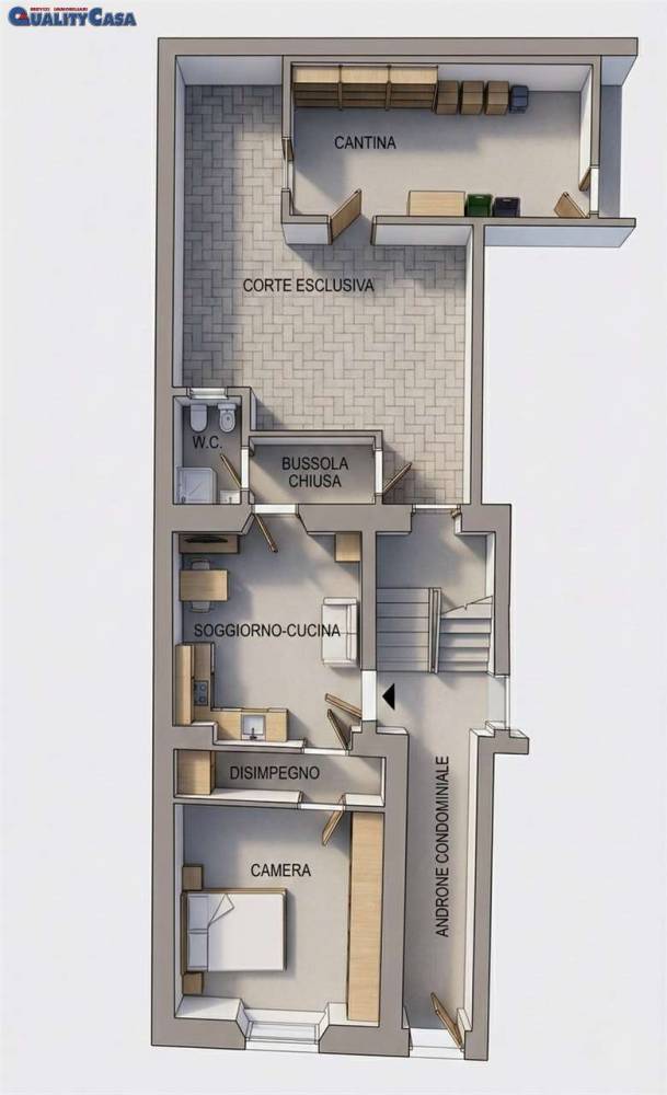 Agenzia immobiliare QualityCASA propone per INVESTIMENTO Appartamento bilocale ristrutturato di 43 mq in centro a Chiaravalle, composto di: Ingresso, soggiorno con angolo cottura, camera, bagno, corte interna con graziosa dependance.