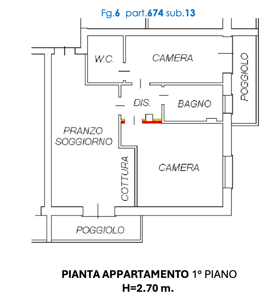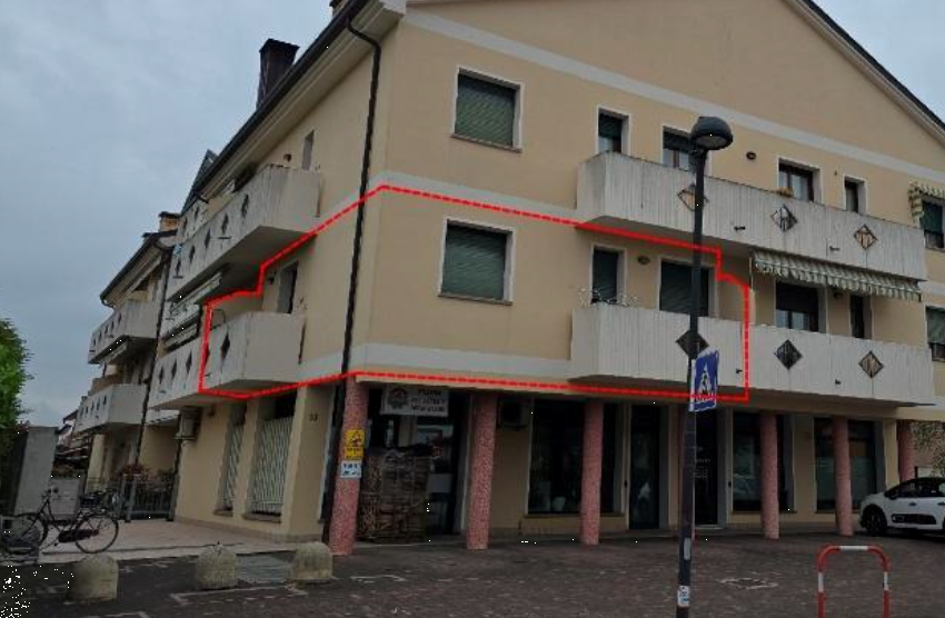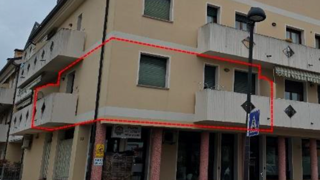 Appartamento al piano primo con annessa autorimessa situato a Veggiano (PD) in via Pedagni, costituito da un ingresso, sala da pranzo, zona cottura e soggiorno organizzato in ununico ambiente con un poggiolo, disimpegno, due camere da letto, un servizio igienico cieco, un bagno finestrato ed un poggiolo.