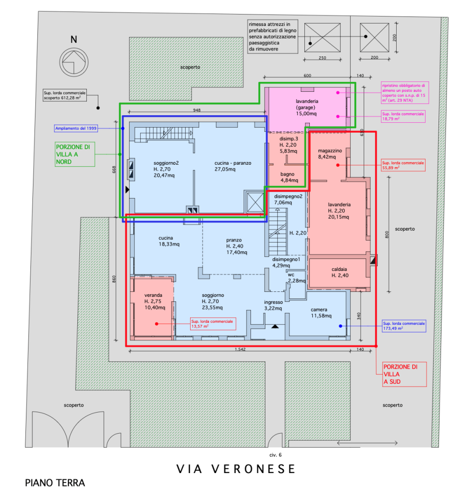 Villa su tre piani situata a Dolo (VE) in via Veronese, composta al piano terra da ingresso-soggiorno con vano scala per accedere al piano interrato e primo, una cucina-sala da pranzo, disimpegno con bagno di servizio, ripostiglio e magazzino; il piano interrato è organizzato a taverna con caminetto; al piano primo composto da un disimpegno, tre camere a letto e due bagni.