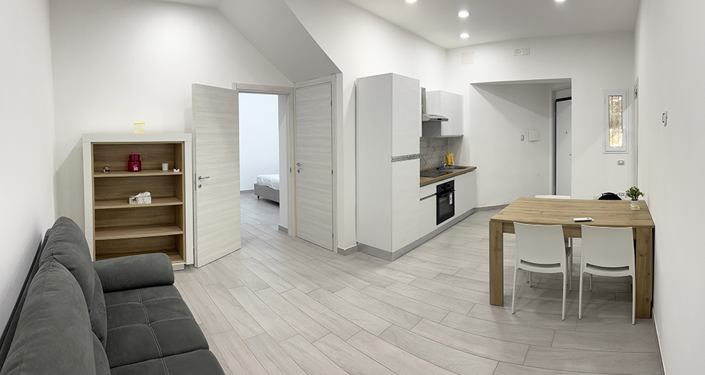 Il bilocale viene consegnato ARREDATO: la cucina è completa di frigorifero, piano cottura ad induzione, forno, cappa e tavolo con n° 4 sedie; la camera da letto è completa di letto matrimoniale, comodini, armadio e cassettone, nel soggiorno è presente un divano/letto matrimoniale.