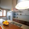 Cucina aperta su soggiorno con isola centrale e ulteriore balcone.
