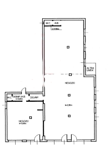 Unità così composta: al piano terra due ambienti, uno più grande e l'altro più piccolo, ognuno con piccolo servizio e affaccio sul viale principale del comune dotato di quattro vetrine e di tre accessi; al piano primo magazzino con terrazza.