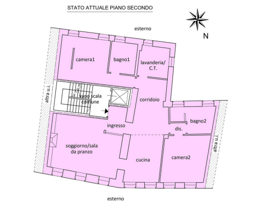 L'unità risulta composta da ingresso, soggiorno/sala da pranzo, cucina, ampio corridoio centrale, lavanderia con centrale termica, due camere, disimpegno e due bagni.