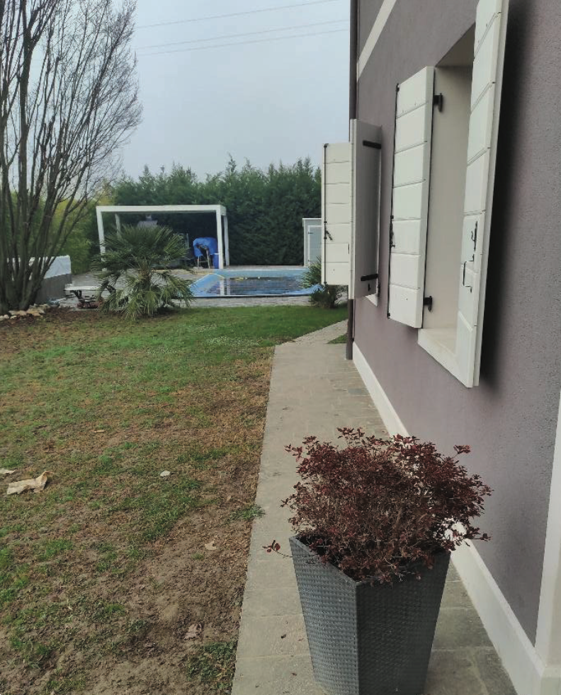 Villa unifamiliare con pertinenziali garage al piano terra, annessa area scoperta esclusiva di 1.407 metri quadri e piscina, situata in Comune di Breda di Piave (TV), località Pero in Strada dei Maretti. Abitazione composta da due portici, ingresso-soggiorno, cucina-sala da pranzo, due disimpegni, lavanderia e bagno al piano terra; due disimpegni, tre camere da letto, guardaroba, bagno, mansarda, due ripostigli e soffitta al piano primo; cantina al piano interrato.