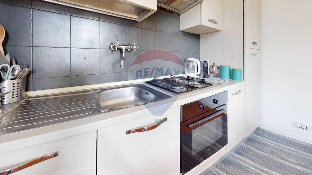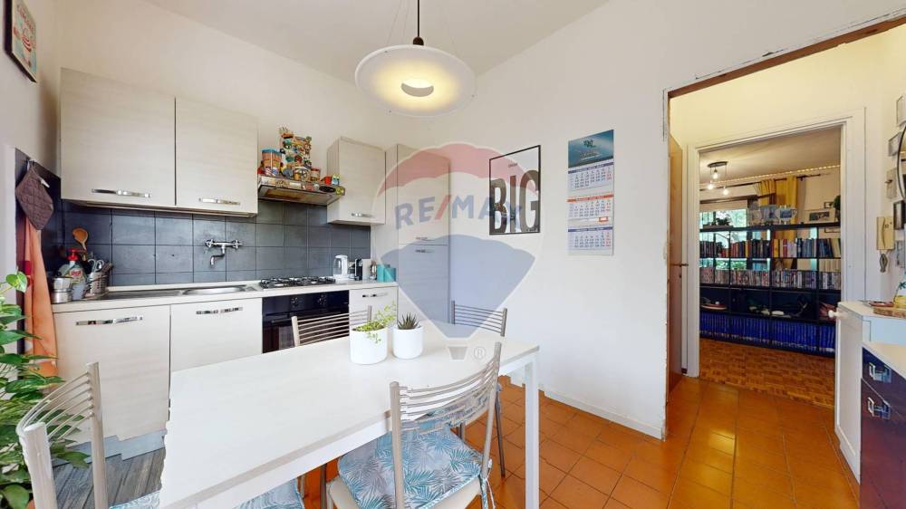 Alla destra della zona giorno troviamo il primo bagno, attualmente adibito a lavanderia, e la cucina abitabile con accesso al secondo balcone, perfetto per pranzi allaperto e sfoghi di servizio.