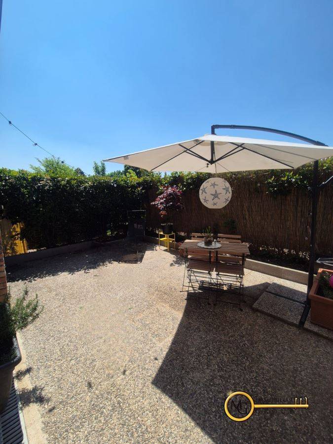 Liscate - in zona residenziale proponiamo grazioso bilocale con giardino. L'immobile si presenta in ottime condizioni interne e si compone di ingresso nel giardino ben curato con ottima esposizione ad ovest, la veranda conduce all'ingresso della zona abitativa dove dalla porta blindata si accede al soggiorno con cucina a vista, camera matrimoniale e bagno con box doccia.nLa solzuione è stata sistemata internamente ed è stato rifatto completamente il bagno, la pavimentazione è in gres, presenta infissi in pvc color legno con doppi vetri, zanzariere ed inferiate, aria condizionata in tutti i locali.nLa proprietà si completa di box singolo e di un posto auto di proprietà.