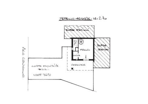 L'unità è composta da ingresso/pranzo con piccola cucina separata, antibagno e bagno al pino terra, collegato mediante scala al piano sottotetto mansardato con disimpegno e due stanze, scoperto esclusivo con veranda e accesso promiscuo pedonale/carrabile.