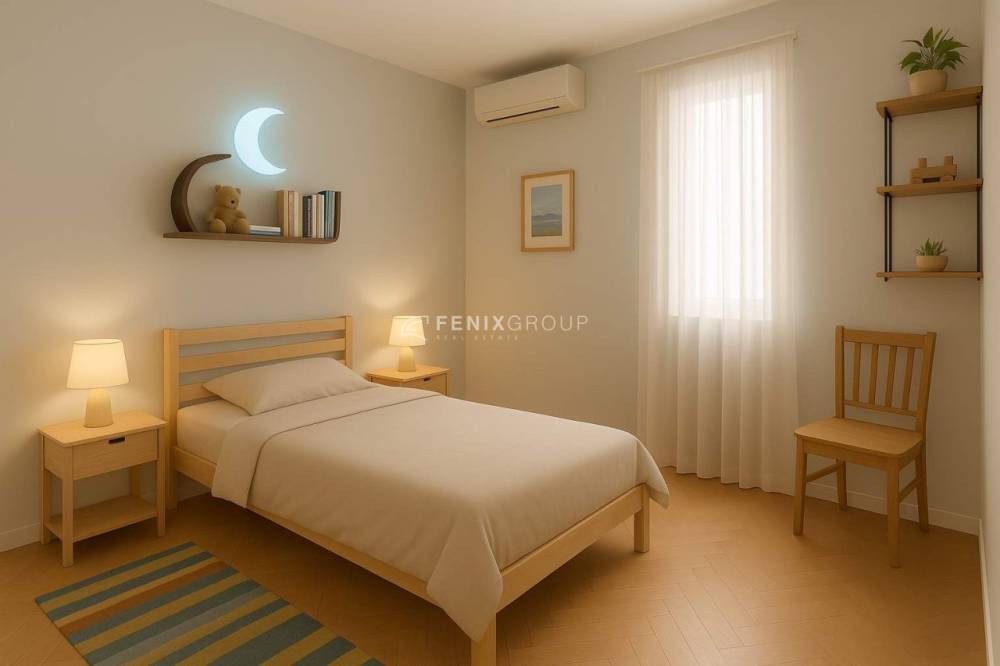 La zona notte comprende una camera matrimoniale padronale con cabina armadio e secondo balcone privato, oltre a una cameretta perfetta per figli, ospiti o come studio.