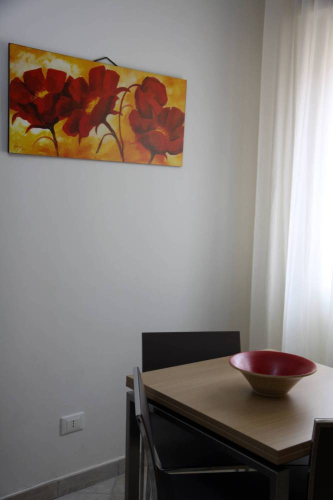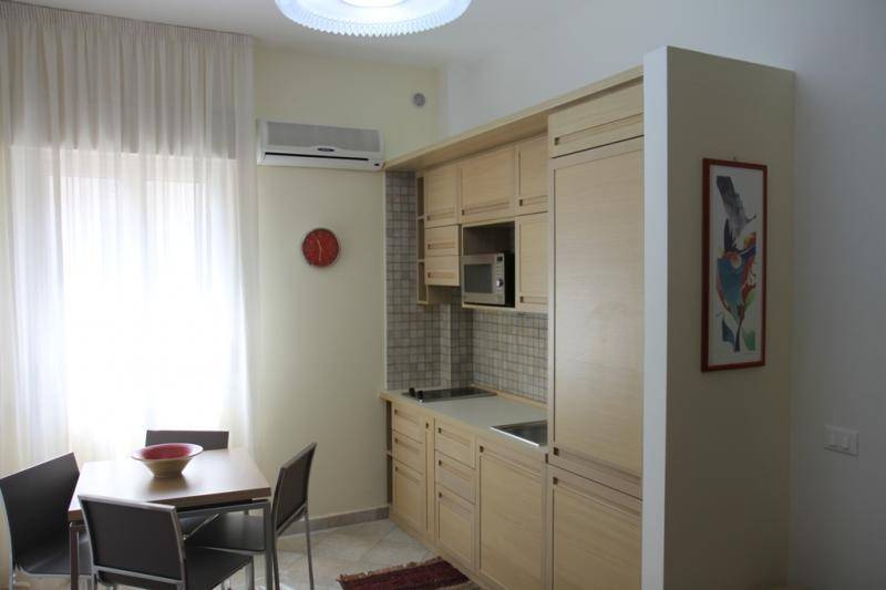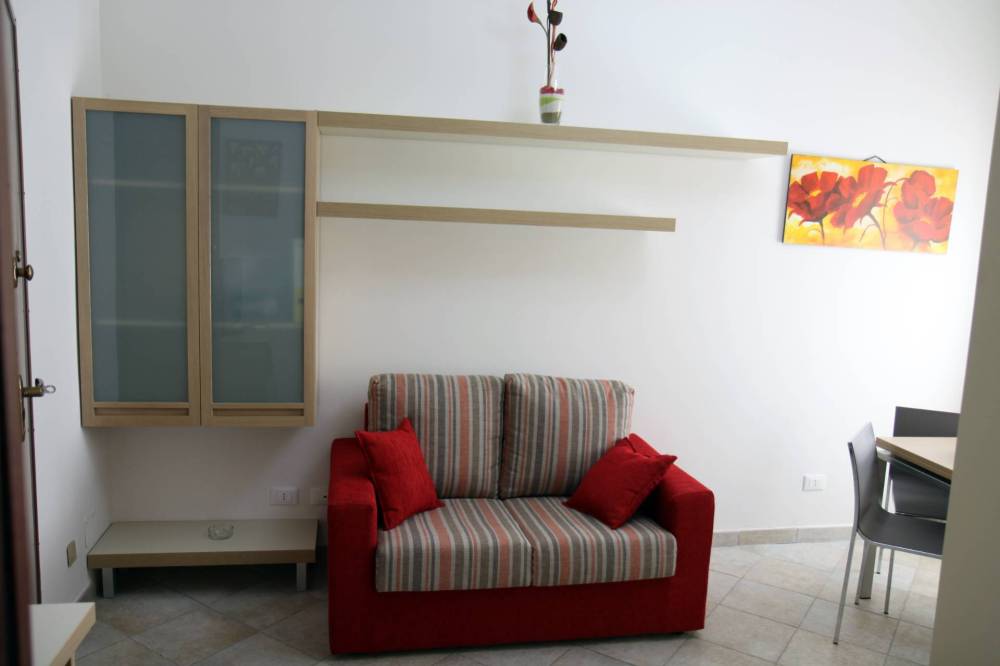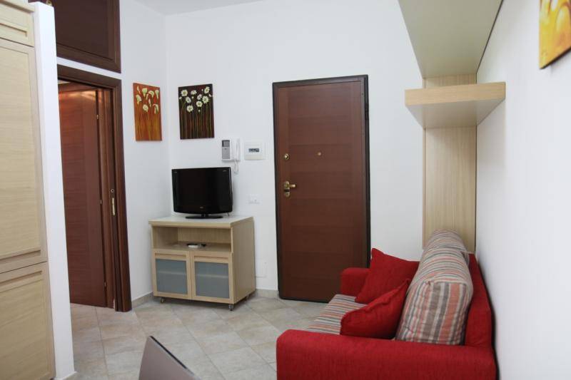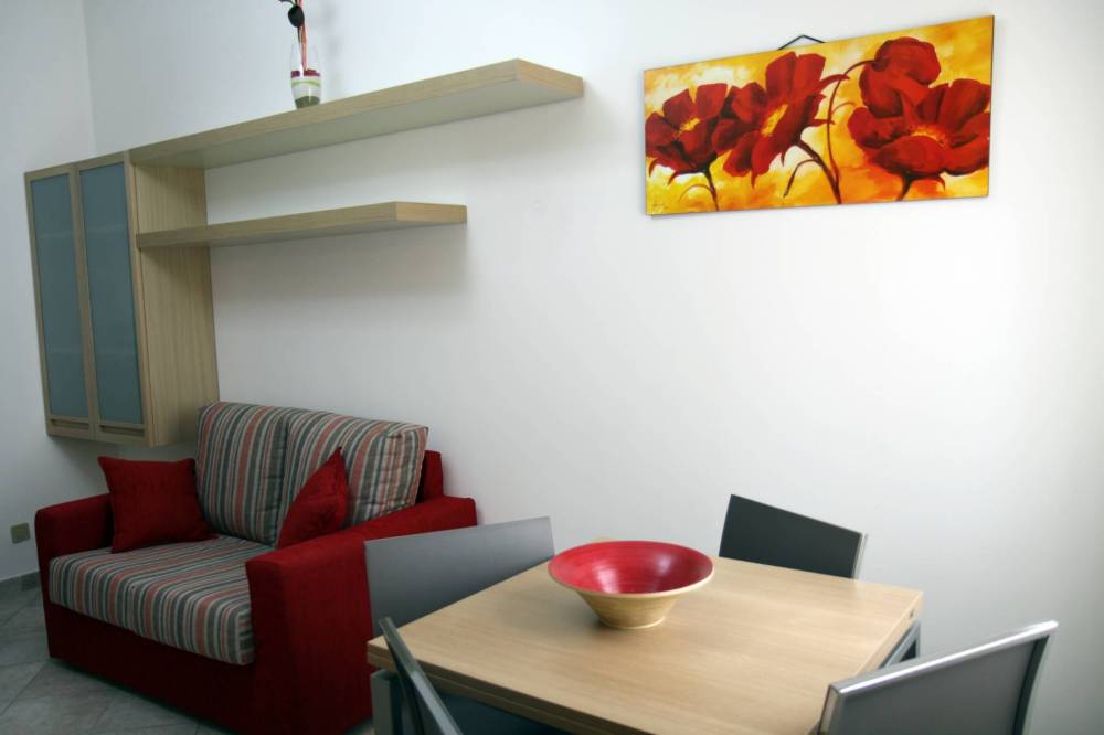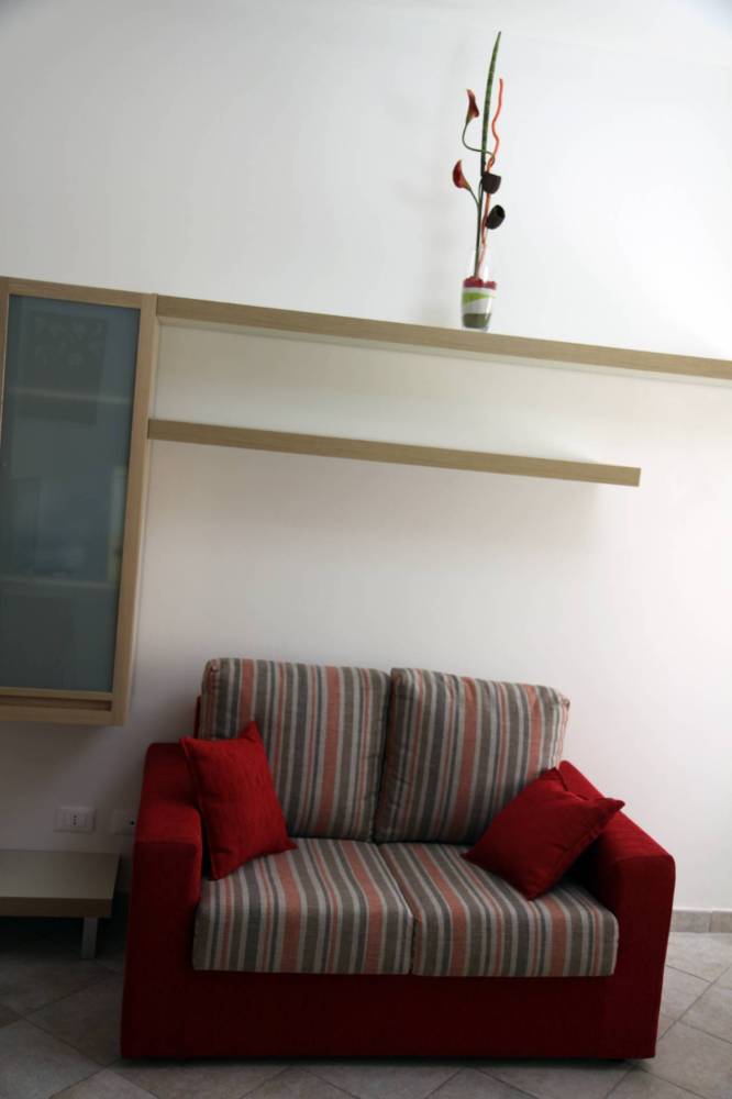 Ingresso su grande ambiente con tavolo e angolo cottura, divano letto, un wc con doccia, camera da Letto e ripostiglio. Stabile fornito di ascensore. Risponde ai più moderni standard abitativi e al rispetto delle più recenti normative in fatto di sicurezza e efficienza energetica. L'appartamento è dotato di videocitofono, tv-lcd con digitale terrestre, predisposizione per canali satellitari, pompe di calore, forno microonde-combinato, frigorifero e freezer, scaldabagno, lavatrice, asse e ferro da stiro, stendibiancheria, set pulizie e scala. Nella zona living troverete un tavolo e relative sedie, una comoda cucina ed altre suppellettili come quadri, vasi etc.