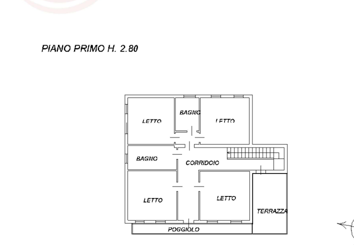 appartamento su due livelli:piano terra: ingresso e vano scala per l'accesso al piano superiore, bagno-lavanderia, al piano primo: corridoio, cucina, salotto, disimpegno zona notte e due camere, due bagni, per una superficie lorda complessiva di mq 125; oltre al poggiolo-terrazza.