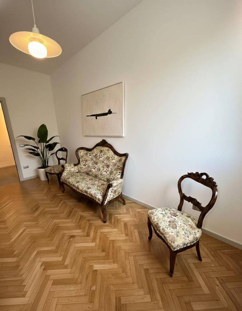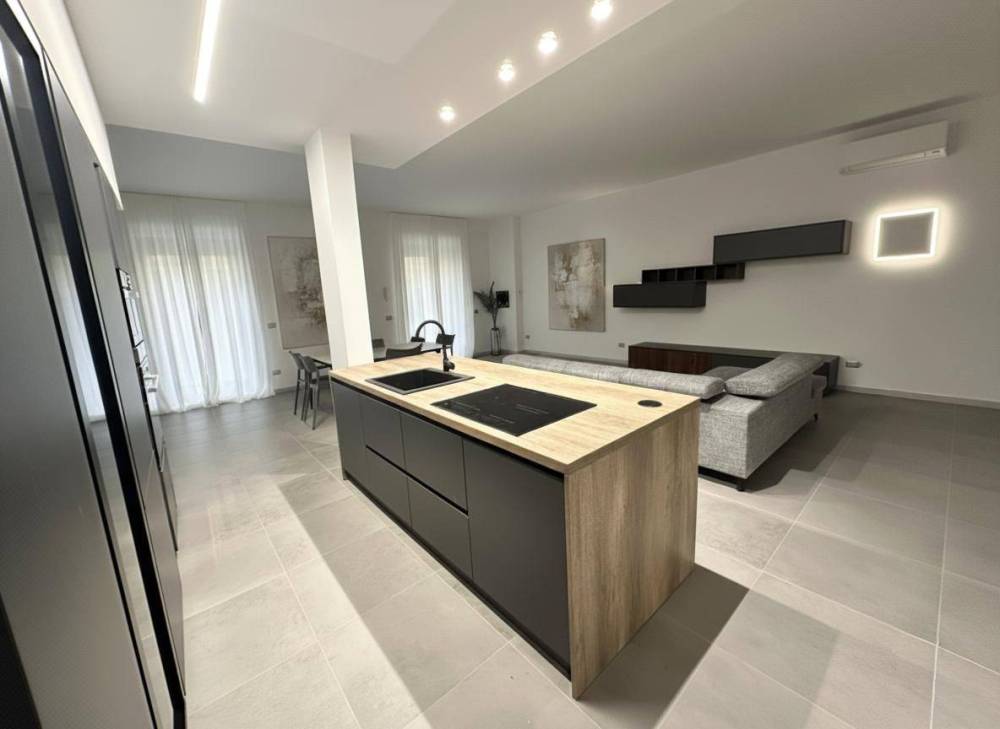 L'appartamento è composto da ampio soggiorno con angolo cottura, luminoso e arredato con gusto e attenzione ai dettagli per garantire un'atmosfera accogliente e confortevole. La cucina con isola è completamente equipaggiata con elettrodomestici moderni e offre ampi spazi di lavoro.