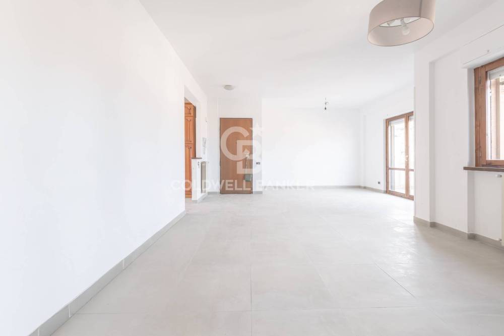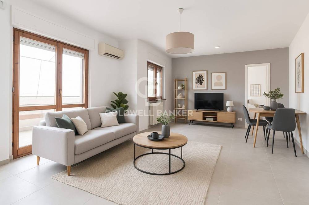 L’appartamento si presenta con un ampio salone che offre accesso diretto al terrazzo, una cucina abitabile collegata a un balcone, due camere da letto e un bagno dotato di doccia e finestra. La generosa metratura consente di rimodulare gli ambienti e di realizzare, qualora lo si desideri, una terza camera da letto e un secondo bagno.