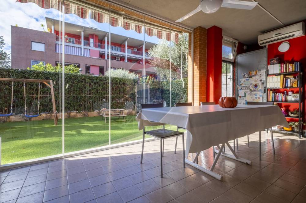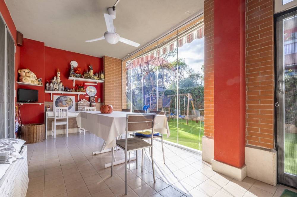Troviamo poi la cucina separata, che offre spazio sufficiente per cucinare in comodità, e la sala da pranzo verandata, un ambiente accogliente e luminoso che si apre anch'esso sul giardino, creando una continuità perfetta tra interno ed esterno.