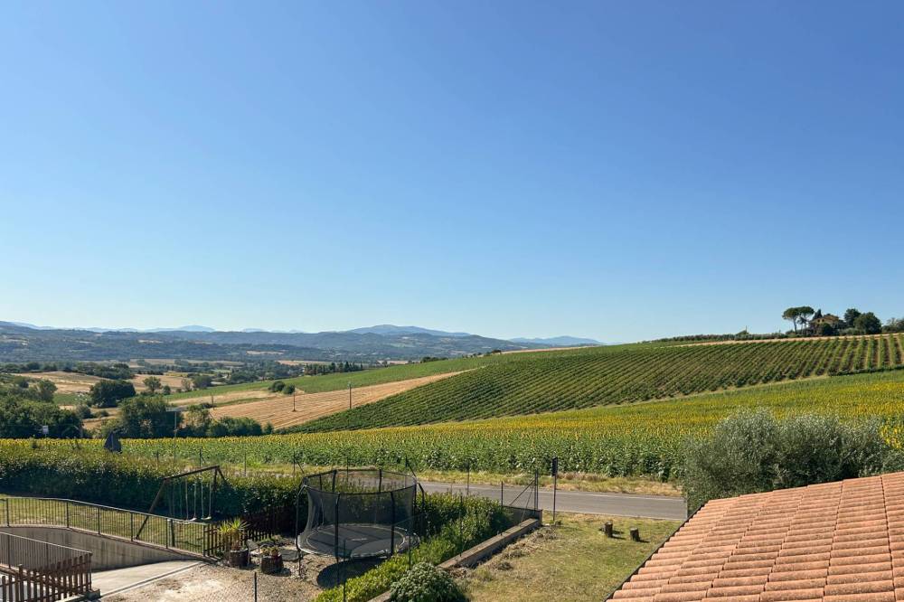 A soli dieci minuti da Marsciano e meno di venti da Perugia, in unelegante posizione collinare con vista aperta sulla campagna umbra, proponiamo una prestigiosa villa indipendente di recente costruzione, suddivisa in due unità immobiliari facilmente unificabili, per una superficie complessiva di circa 250 m².