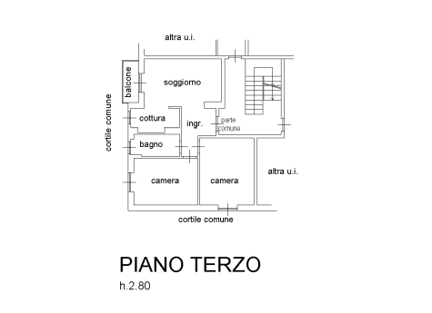 L'immobile è posto al piano terzo, composto da disimpegno d'ingresso, soggiorno con angolo cottura, due camere, un bagno, un balcone, oltre vano di cantina al piano primo interrato.