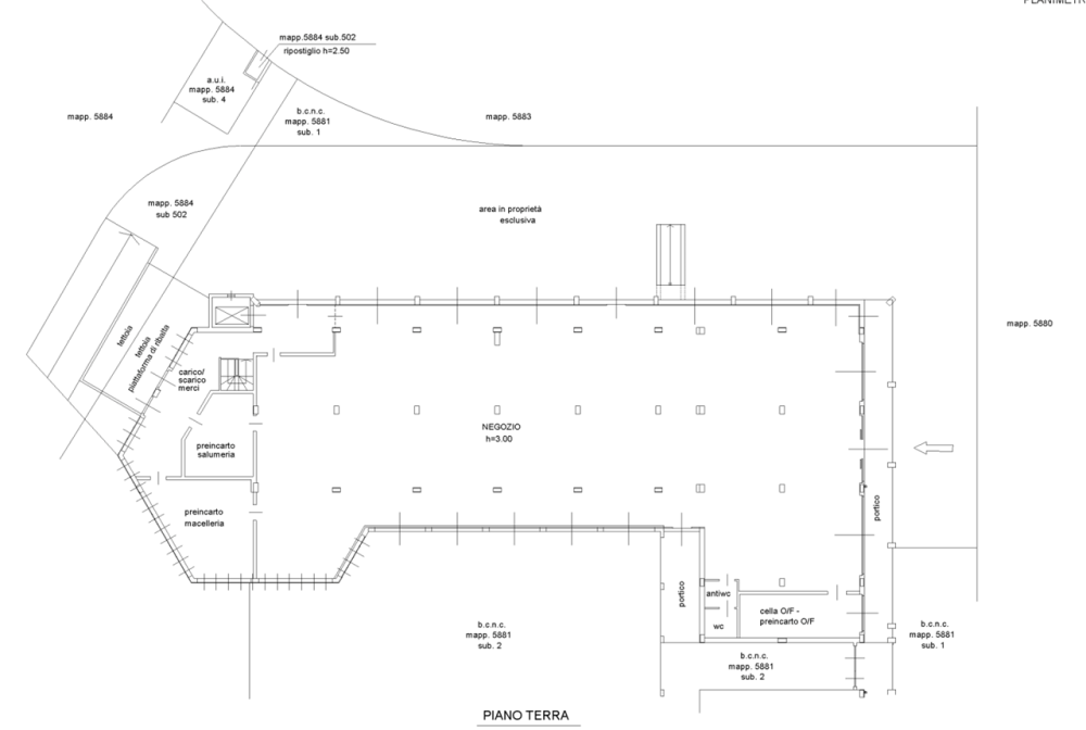 Al piano terra si trova l'intera area di vendita, nella parte posteriore dell'area a negozio, vengono rilevate le stanze di preparazione dei salumi, della