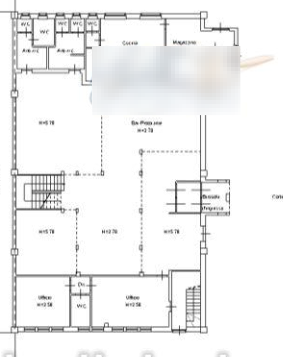 Nell'area a nord-ovest sono collocati due servizi igienici separati per genere: quello femminile dispone di un grande antibagno con due lavabi e due bagni, di cui uno accessibile a persone con ridotte capacità motorie; quello maschile è costituito da un antibagno con due lavabi, due orinatoi e due bagni. Tra i servizi igienici e il bancone si trova la porta d'accesso alla cucina, dotata di montavivande verso il primo piano, rivestimenti murari fino a due metri di altezza e pavimentazione chiara, oltre a un piccolo servizio igienico per il personale. Dalla cucina si accede a un ampio magazzino con forno per pizza, caldaia, elettrodomestici e a un locale con cella frigorifera per la conservazione degli alimenti; i due locali comunicano tramite un foro nella tramezza. A sinistra dell'ingresso è presente una piccola area ludica con giochi come flipper e calciobalilla. Dal piano terra, una scala conduce al primo piano, realizzato in parte a soppalco, dove sono collocati ulteriori tavoli per la consumazione dei pasti.
