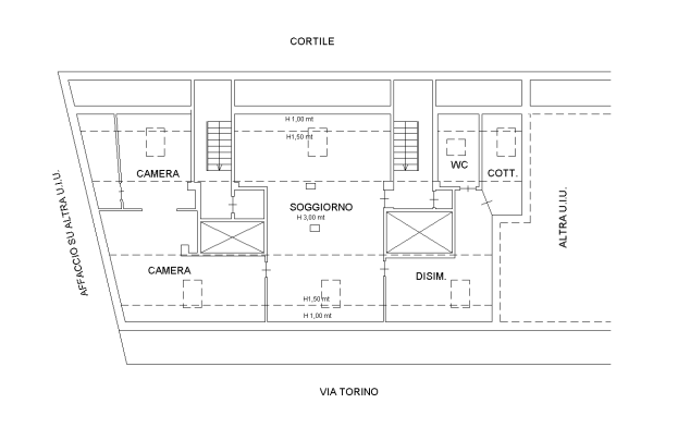 L'immobile è posto al piano sesto mansardato composto da ingresso living su soggiorno, due camere, disimpegno, bagno, cucinino e ripostiglio.