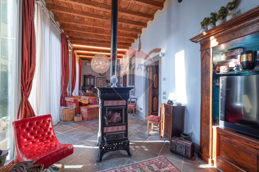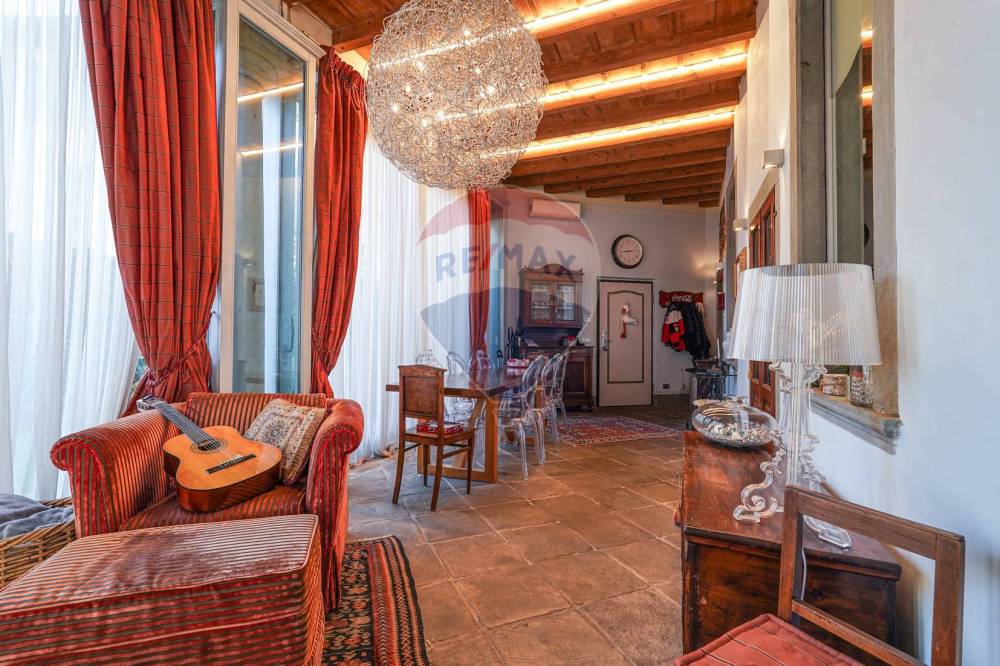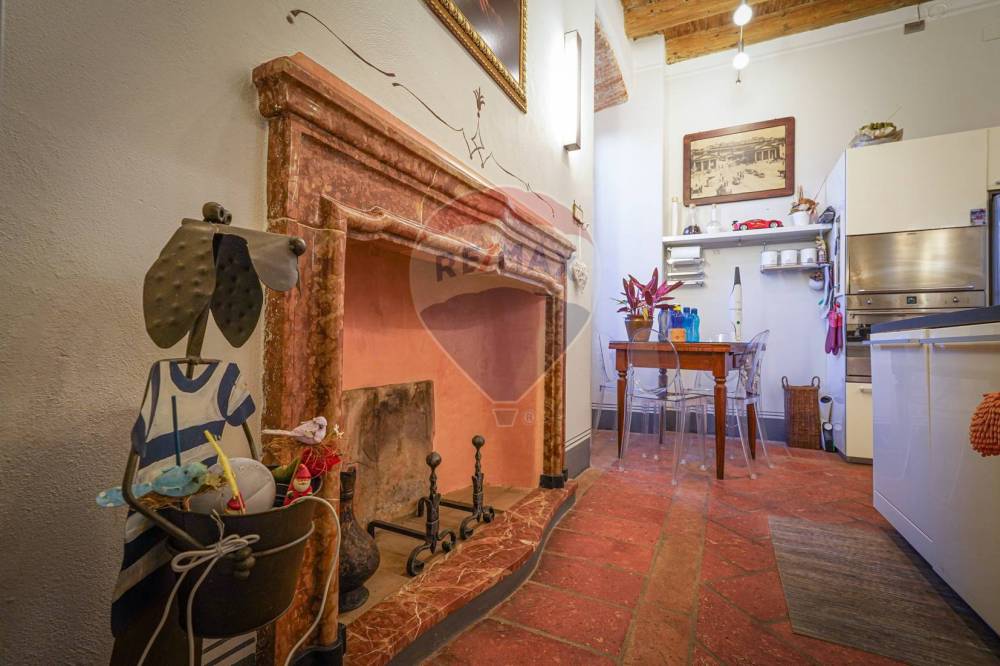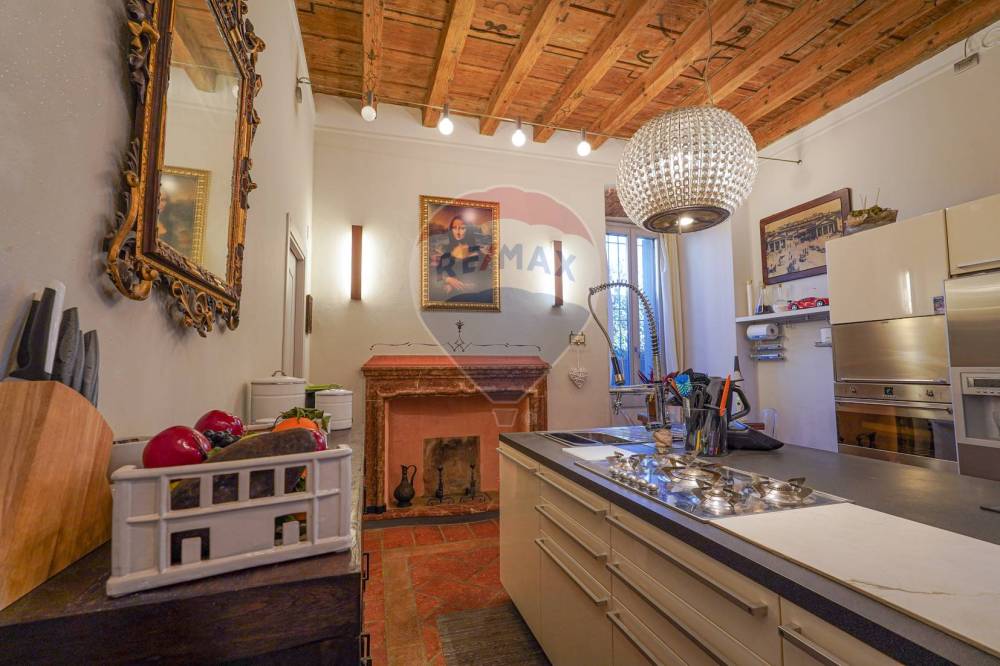 In tutto l'appartamento abbiamo i richiami d'epoca: il soffitto con le travi a vista, i pavimenti in cotto originale, gli affreschi e le porte originali d'epoca, fatte restaurare dalla proprietaria. Nessun dettaglio è stato lasciato a caso.