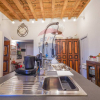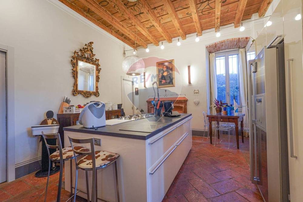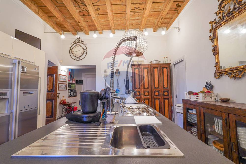 Dal salone si accede alla cucina separata di generose dimensioni con un mobile cucina moderno e un'isola centrale. Un mix tra il moderno e l'antico d'impatto.