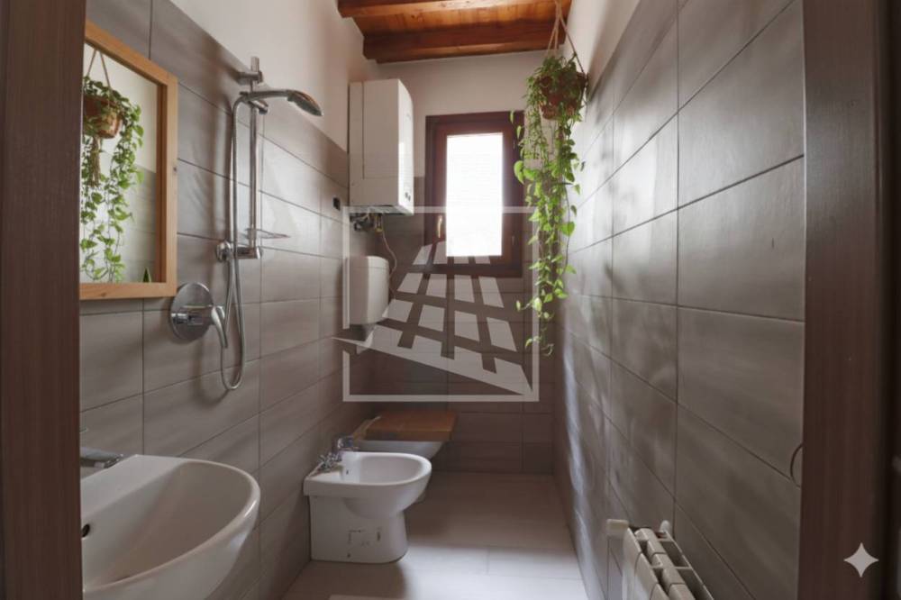 L'abitazione è caratterizzata da suggestivi soffitti in legno con travi a vista, che conferiscono un'atmosfera calda e accogliente.